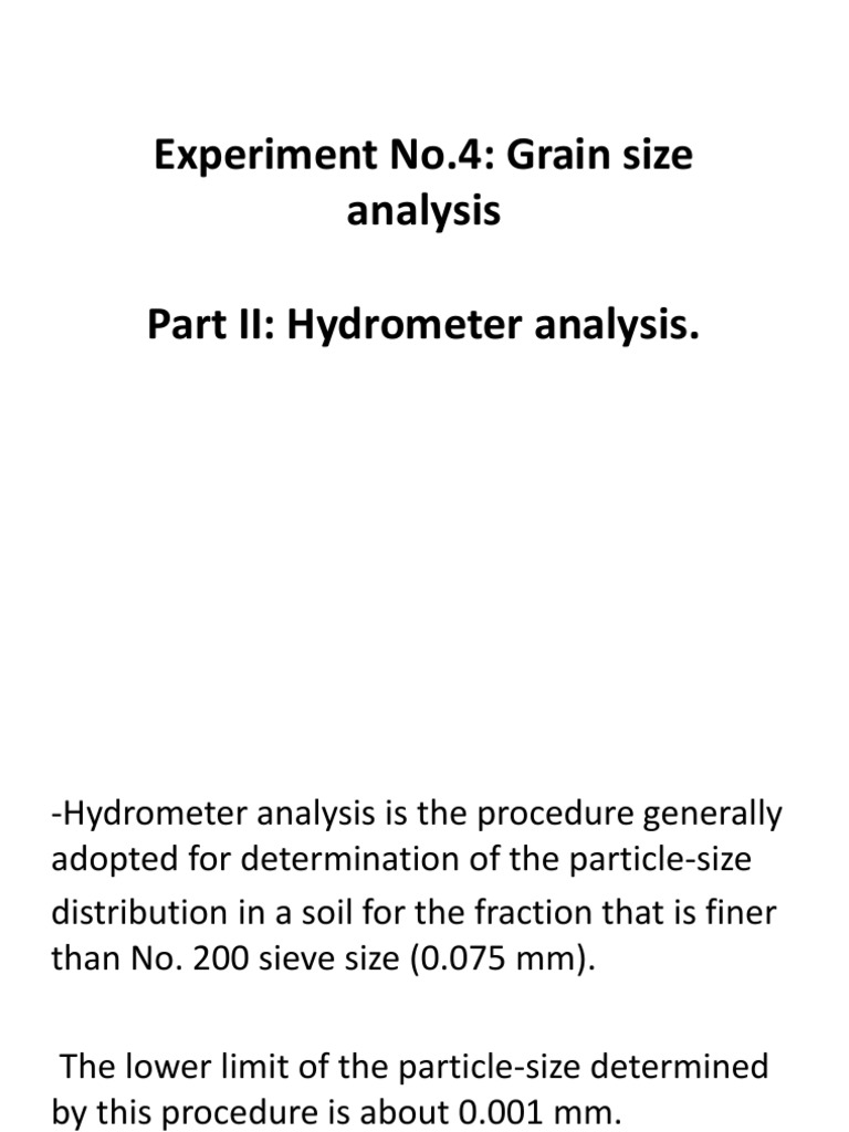 Experiment 4_Hydrometer Analysis Soil Mechanics Laboratory Tests Grain Size Analysis Hydrometer Method the hydrometer analysis of soil, based on stokes’ law, calculates the size of soil particles from the speed at which they settle out of suspension from a liquid. the hydrometer analysis is a widely used method of obtaining an estimate of the distribution of soil particle sizes from the. the new york state department of transportation geotechnical. Grain Size Analysis Hydrometer Method.